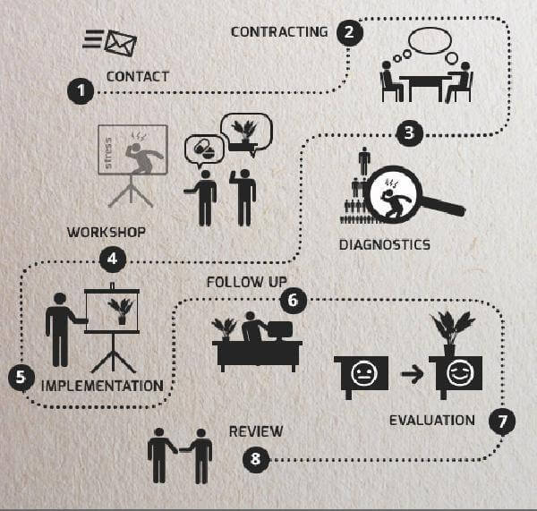 A szervezetfejlesztési folyamat során nagy hangsúlyt fektetünk a diagnosztikára, mely során kvalitatív, kvantitatív és hálózatkutatási mószertannal dolgozunk. Szervezetfejlesztési tapasztalataink alapján kidolgoztunk egy saját diagnosztikai modellt (SZERDA), melyet a klasszikus modellekkel kombinálva alkalmazunk. A szervezeti beavatkozást minden esetben diagnosztika alapján tervezzük meg: stratégiai workshopok, új értékek megteremtését célzó workshopok, készségfejlesztő tréningek, képzések, folyamatátszervezések (pl. lean) módszereket alkalmazunk. A jobb oldalon található ábrán összefoglaltuk, miként zajlik nálunk egy szervezetfejlesztési folyamat.